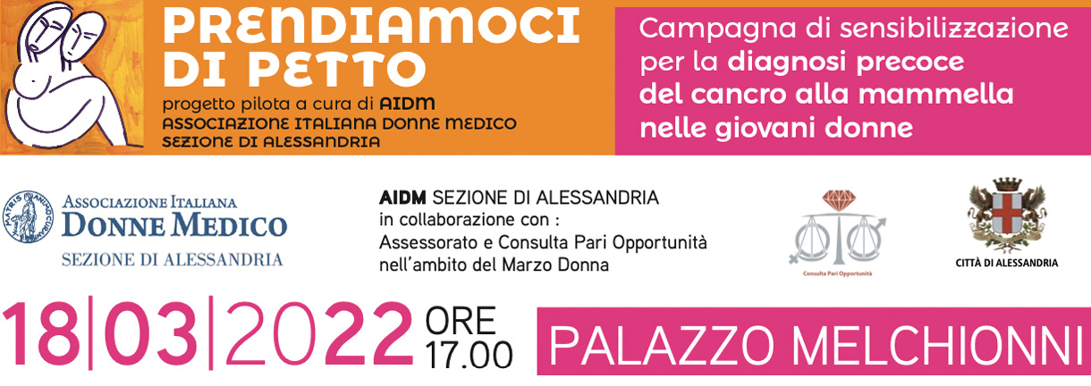 In occasione di Marzo in Rosa, mese dedicato alle donne e alla prevenzione, sono felice di rendervi partecipi di una splendida iniziativa promossa dall’Associazione Italiana Donne Medico di Alessandria che si chiama “Prendiamoci di petto”, un progetto nell’ambito della campagna di sensibilizzazione per la diagnosi precoce del cancro alla mammella nelle giovani donne.