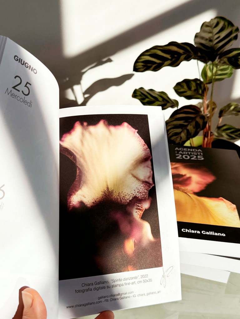 Felicissima, dunque, di farne parte anche quest’anno ed onorata di partecipare con due delle mie opere della serie Inside Beauty: “Energia vitale” (2022) in copertina, un’opera che richiama alla memoria sensazioni ancestrali, come in una dimensione onirica l’occhio si lascia catturare e l’anime trasportare all’interno del proprio spazio interiore; “Spirito danzante” (2022) all’interno dell’Agenda, nel mese di Giugno, un’opera che sembra invitare alla danza e che vibra di emozioni alte, dalle tonalità neutre e spirituali.