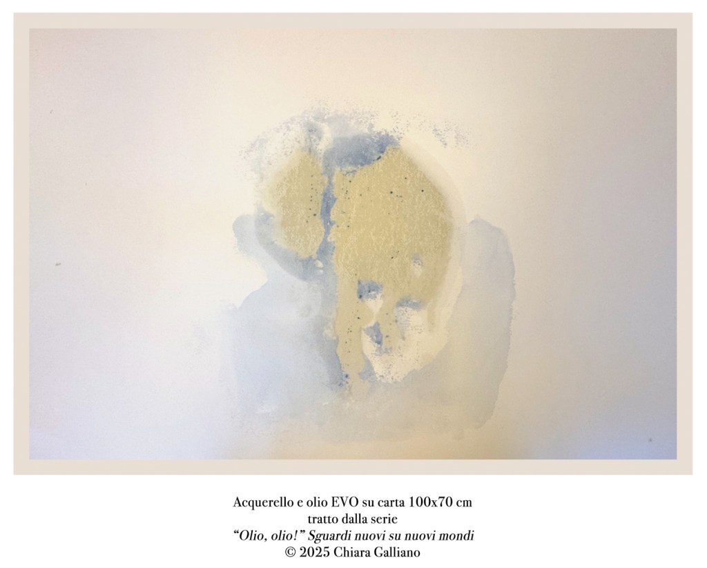 Da questo connubio è nata una nuova mappa, un pianeta oleo-acqueo immaginario, dove ho tracciato, mossa da fulminea ispirazione, continenti fatti d’olio lambiti dalle acque marine, acquerellate sul foglio di carta.