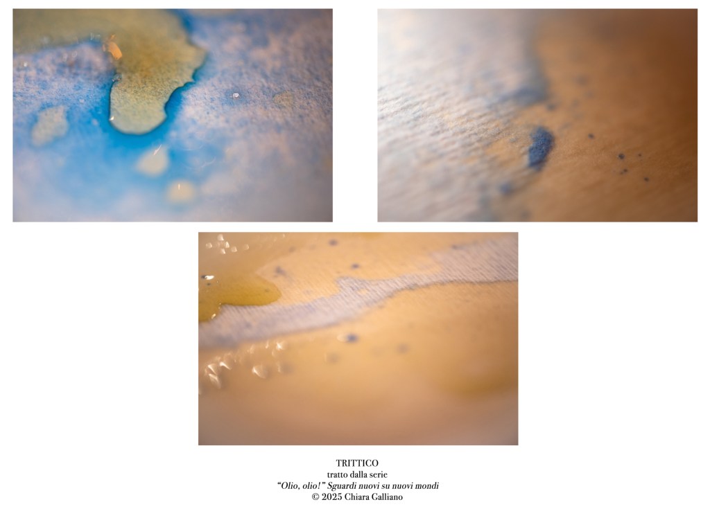 L’ispirazione per questa serie di opere è arrivata pensando liberamente a questi due liquidi, l’acqua e l’olio, lasciandomi suggestionare del tema di quest’edizione del Festival che è “l’olio e il mare” e che, per questo motivo, anziché celebrarsi a Milano come consuetudine, sarà ospitato dalla città di Genova, all’interno dei Magazzini del Cotone, dal 27 Febbraio al 1 Marzo.