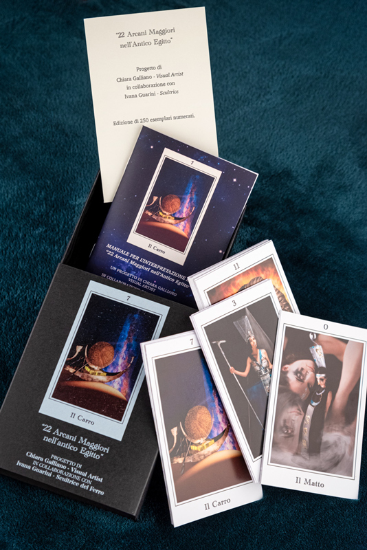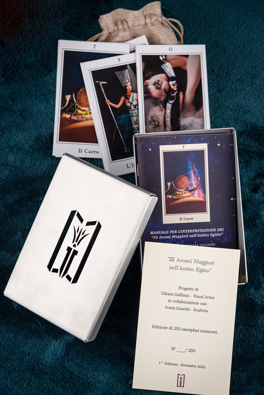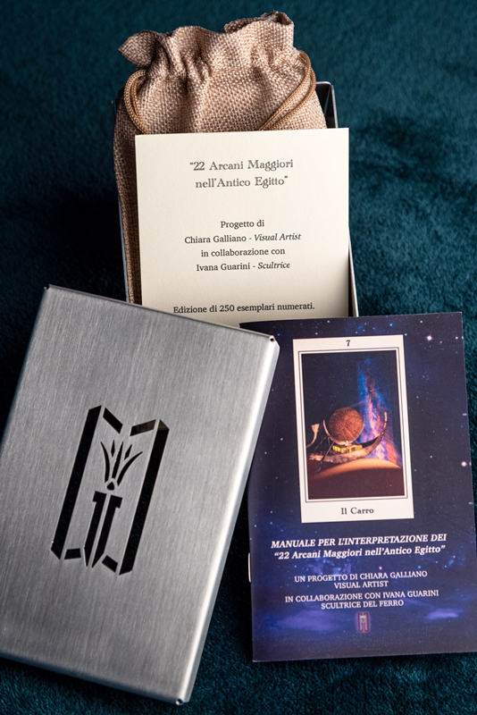 Nelle foto le scatole in edizione limitata che racchiudono i 22 Arcani Maggiori: una versione in cartoncino stampato ed una versione in metallo disegnata e rifinita a mano dalla Guarini con logo intagliato. Entrambe le scatole racchiudono il mazzo di Tarocchi, il certificato di autenticità che ne garantisce l’edizione numerata ed il manuale per l’interpretazione di ogni Arcano con la relativa corrispondenza del significato con l’Antico Egitto.