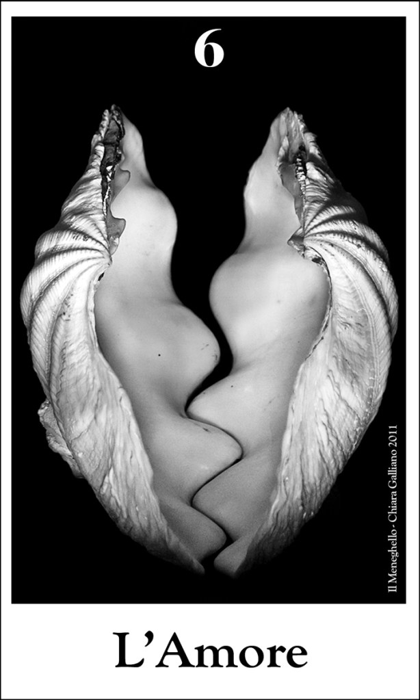 “Nel 2011 ho iniziato una bellissima collaborazione con il pittore milanese Osvaldo Menegazzi – Il Meneghello. Tra le sue opere più conosciute i numerosi mazzi di Tarocchi da lui dipinti e del quale è editore esclusivo. Con grande gioia ed entusiasmo ho accettato la sua proposta di creare per lui il suo primo mazzo di Tarocchi fotografici. Così nacque la prima opera “22 Conchiglie in 22 Arcani” e la successiva opera ancora più ambiziosa ed impegnativa che mi ha vista indossare i panni di art director, oltre che di artista, dal titolo “22 Fotografi in 22 Arcani”. L’amicizia e la stima che nutro nei confronti di Osvaldo Menegazzi sono da allora immutati così come il desiderio di proseguire nel creare altre opere di questo genere a continuazione di queste prime due serie già realizzate, che ricordo essere in edizioni limitate.